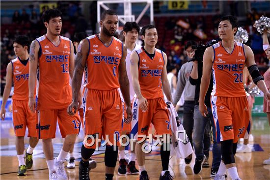 [인천=아시아경제 김현민 기자] 2015-2016 프로농구 인천 전자랜드와 원주 동부의 경기가 28일 인천 삼산월드체육관에서 열렸다. 72-84로 패한 전자랜드 선수들이 코트를 나서고 있다.