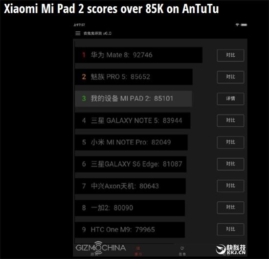 30일 외신에 따르면 미패드2는 안투투 벤치마크테스트에서 8만5101점을 기록했다. 이는 엑시노스 7420을 탑재한 삼성 갤럭시 노트5의 8만3944점보다 높은 점수다.