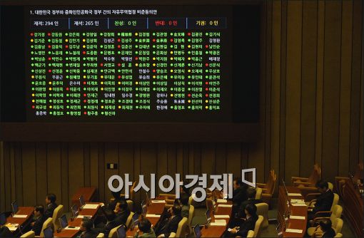 [아시아경제 윤동주 기자] 한중 FTA 비준 동의안이 30일 국회 본회의에서 재석 의원 265명 가운데 찬성 196표, 반대 33표, 기권 36표로 통과됐다.
