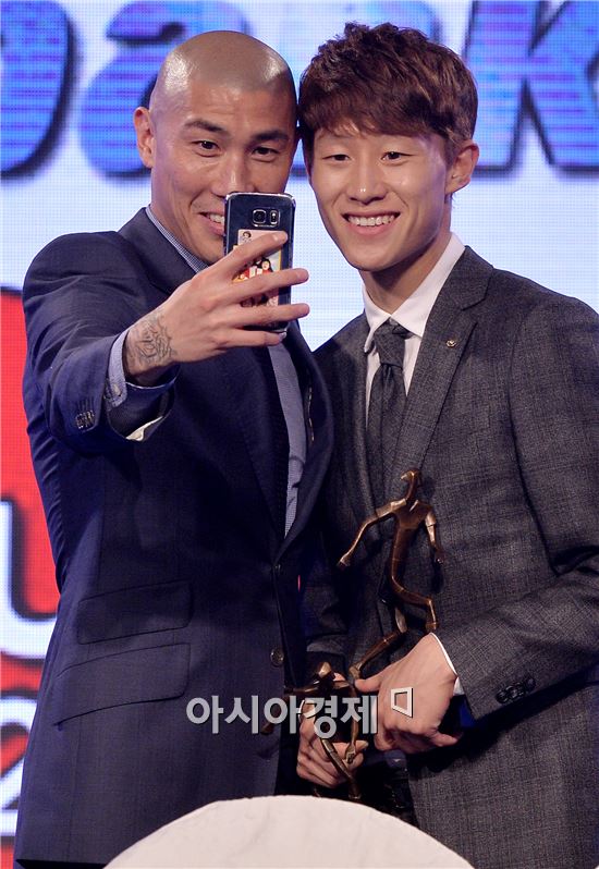 [아시아경제 김현민 기자] 2015 K리그 대상 시상식이 1일 서울 홍은동 그랜드힐튼호텔에서 열렸다. FC서울 차두리가 전북 현대 이재성과 휴대폰으로 추억을 담고 있다.
