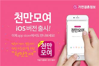 [아시아경제 최서연 기자] 결혼정보회사 가연은 모바일 결혼정보서비스 ‘천만모여’의 iOS 버전을 출시했다고 4일 밝혔다.