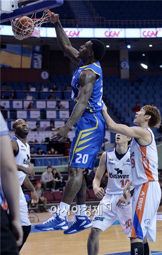 [잠실=아시아경제 김현민 기자] 2015-2016 프로농구 서울 삼성과 인천 전자랜드의 경기가 4일 잠실실내체육관에서 열렸다. 삼성 라틀리프가 상대 수비를 뚫고 덩크슛을 성공시키고 있다.