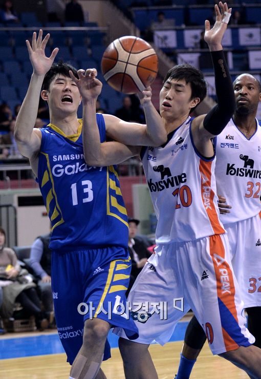 [잠실=아시아경제 김현민 기자] 2015-2016 프로농구 서울 삼성과 인천 전자랜드의 경기가 4일 잠실실내체육관에서 열렸다. 삼성 임동섭이 상대 정효근과 리바운드를 다투고 있다.