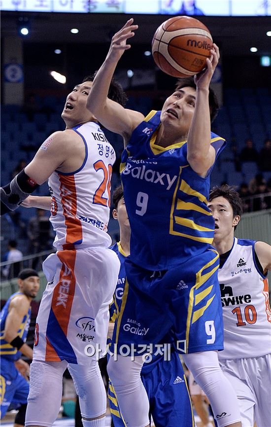 [잠실=아시아경제 김현민 기자] 2015-2016 프로농구 서울 삼성과 인천 전자랜드의 경기가 4일 잠실실내체육관에서 열렸다. 삼성 주희정이 리바운드를 잡아내고 있다.