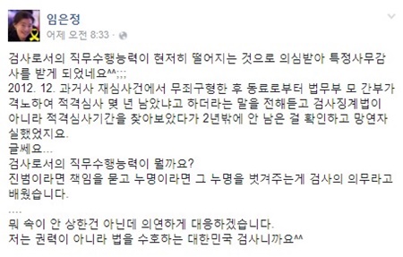 [아시아경제 온라인이슈팀]과거사 재심사건에서 상부 지시를 어기고 무죄를 구형했다가 징계를 받은 임은정 검사(41, 사법연수원 30기)가 심층 적격심사를 받게 된 가운데 자신의 페이스북에 심경을 남겨 눈길을 끈다.