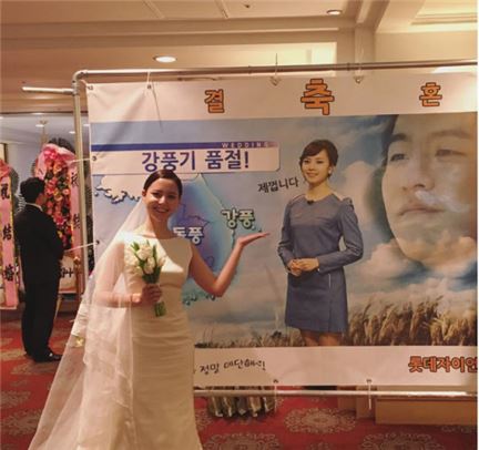 이와 함께 신소연은 독특한 사진 한 장을 게시했다. 사진 속 웨딩드레스를 차려입은 신소연은 마치 기상 안내를 하는 포즈를 취하고 있다. 신소연 뒤의 벽면에는 실제 기상 안내 중인 신소연의 사진과 함께 '강풍기 품절', '제껍니다' 등의 문구가 새겨져 있다. 뒤에는 강민호의 얼굴이 흐릿하게 새겨져 있어 눈길을 끈다.