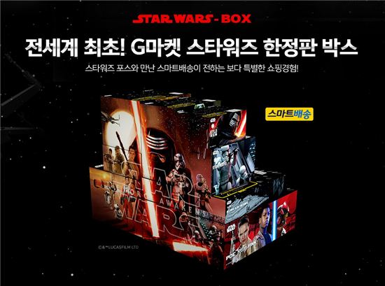G마켓은 12월 한달동안 스마트배송 이용 고객에게 스타워즈 캐릭터로 꾸며진 택배박스로 상품을 배송해 주는 프로모션을 진행한다. 택배박스는 총 8가지 디자인을 적용하여 랜덤으로 배송되며, 약 40만개의 물량을 준비했다. 랩핑 택배박스와 함께 깜짝 선물도 함께 배송한다.