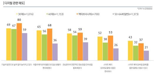 액티브 시니어 계층은 '기술의 발전으로 삶의 질이 높아지고 있다'는 응답이 80%로 30대(69%), 40대(67%), 일반 50~64세(59%)보다 높은 비중을 차지했다. 액티브 시니어 계층에서 '스마트페이(모바일결제) 사용이 편리하다'는 응답률은 53%로 30대(52%)와 비슷하게 나타났다.