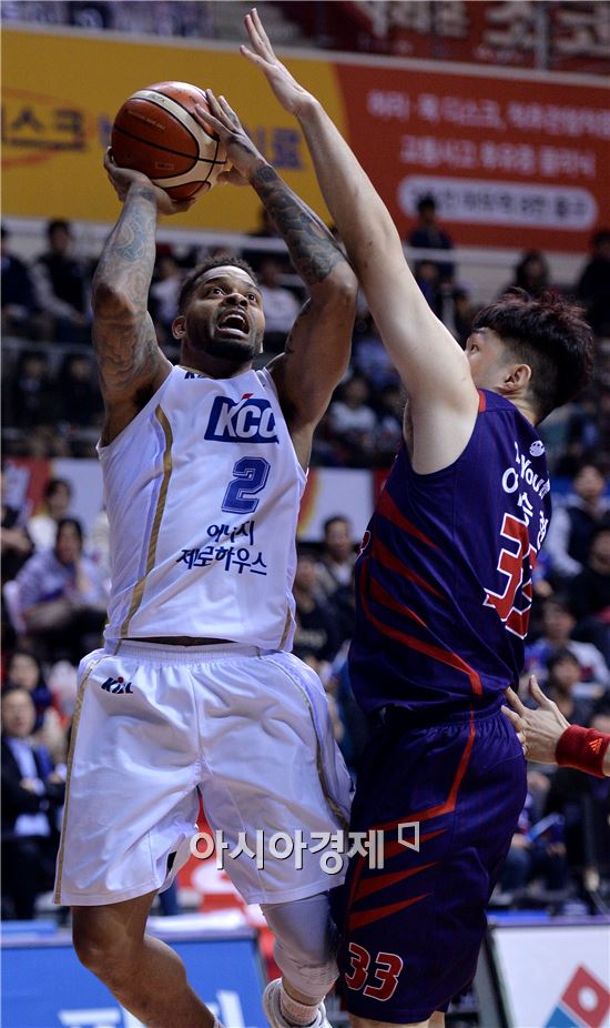 [고양=아시아경제 김현민 기자] 2015-2016 프로농구 고양 오리온과 전주 KCC의 경기가 9일 고양체육관에서 열렸다. KCC 에밋이 상대 수비를 뚫고 공격하고 있다.