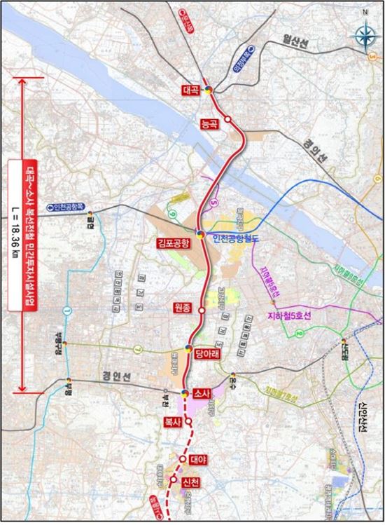 총사업비는 보상비 964억을 제외한 1조634억원이 투입되며 대곡과 능곡, 김포공항, 원종, 당아래 등 5개 정거장이 만들어 진다. 국토부는 출·퇴근 시 9분, 평시 15분 간격으로 열차를 운행할 계획이다.