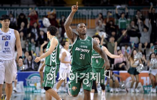 [원주=아시아경제 김현민 기자] 2015-2016 프로농구 원주 동부와 전주 KCC의 경기가 11일 원주종합체육관에서 열렸다. 동부 맥키네스가 득점한 뒤 세리머니하고 있다.