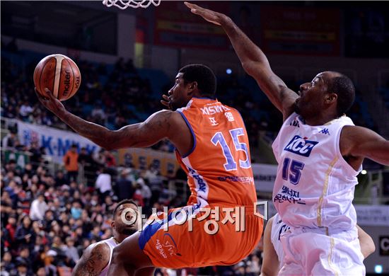 [인천=아시아경제 김현민 기자] 2015-2016 프로농구 인천 전자랜드와 전주 KCC의 경기가 13일 인천 삼산월드체육관에서 열렸다. 전자랜드 포웰이 상대 수비를 뚫고 공격하고 있다.