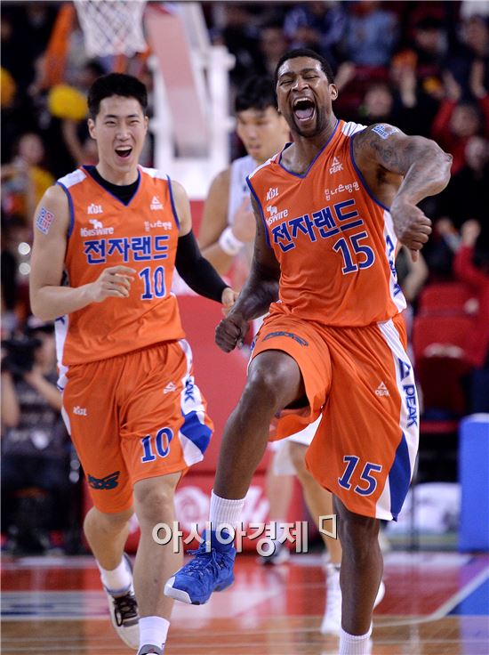 [인천=아시아경제 김현민 기자] 2015-2016 프로농구 인천 전자랜드와 전주 KCC의 경기가 13일 인천 삼산월드체육관에서 열렸다. 전자랜드 포웰이 역전에 성공한 뒤 기뻐하고 있다.