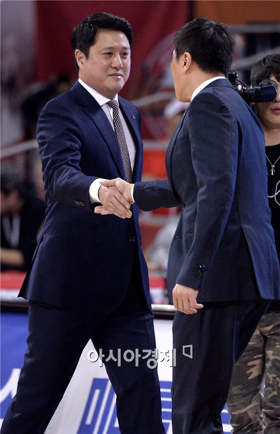 [잠실=아시아경제 김현민 기자] 2015-2016 프로농구 서울 SK와 서울 삼성의 경기가 15일 잠실학생체육관에서 열렸다. SK 문경은 감독이 경기 후 삼성 이상민 감독과 인사하고 있다. 85-80 삼성 승리.