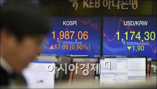 [아시아경제 윤동주 기자] 미 연방준비위원회의 기준금리 인상이 발표된 17일 서울 중구 KEB하나은행 딜링룸에서 딜러들이 바쁘게 움직이고 있다.