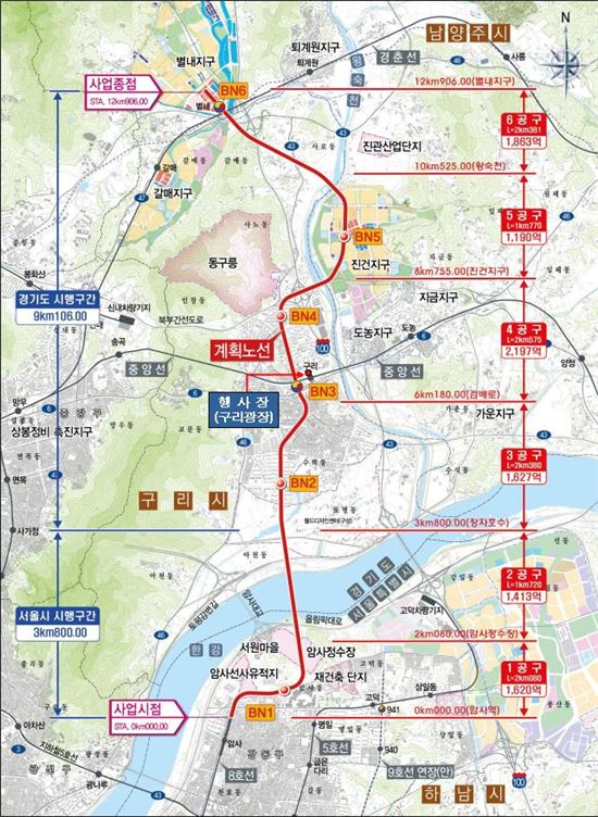 6개 공구 가운데 1∼2공구 2.6㎞는 서울시가, 3∼6공구 10.3㎞는 경기도가 각각 공사를 맡으며 현재 설계 중이다. 착공식이 열린 구리광장은 별내선 1∼6공구 가운데 공사가 가장 먼저 시작되는 6공구에 속한 곳이다.