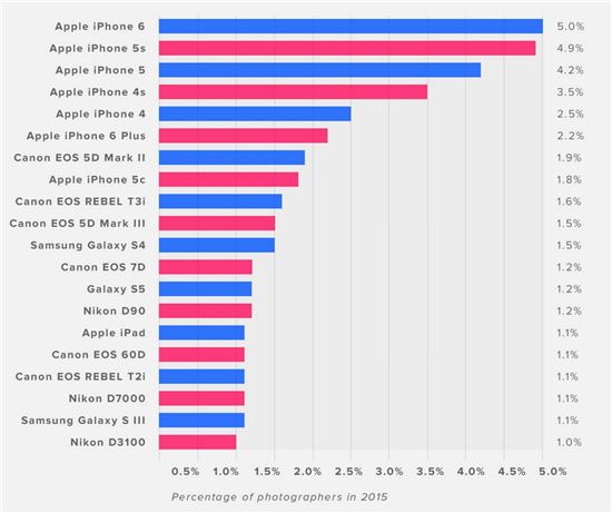 20일(현지시간) 플리커는 2015년 게재된 사진의 카메라 기종과 브랜드를 조사한 결과 이같이 나타났다고 밝혔다.