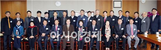 이낙연 전남지사가 21일 오전 집무실에서 행정ㆍ안전분야, 경제분야, 문화ㆍ체육ㆍ관광분야, 보건ㆍ복지분야, 농업ㆍ수산분야, 건설ㆍ교통ㆍ환경분야, 여성분야 등 전라남도사회단체연합회 대표와 간담회를 가진 뒤 기념촬영을 하고 있다. 사진제공=전남도