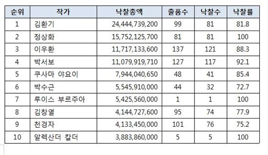 작가별 낙찰총액 기준 순위는 1위 김환기(약 244억4500만원)에 이어 2위 정상화(약 157억5200만원), 3위 이우환 (약 117억1700만원), 4위 박서보(약 110억8000만원), 5위 쿠사마 야요이 (약 79억4400만원), 6위 박수근(약 55억4600만원), 7위 루이스 부르주아(약 54억2600만원) 순이었다. 김환기 작품은 작년에도 낙찰총액 순위에서 1위를 차지했다. 금액면에서 보면 올해는 작년(약 100억원)의 2배 규모로 낙찰총액이 급상승했다. 30순위에 랭크된 작가 중 김환기, 정상화, 이우환, 박서보 등 단색화 작가들의 낙찰 총액이 59%로 과반 이상을 차지했다.