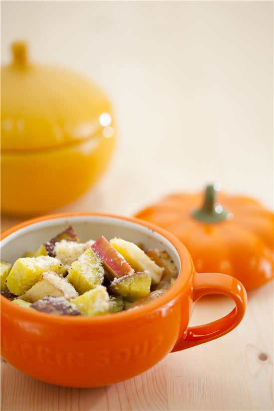 3. 생크림, 우유에 삶은 고구마와 사과를 넣고 너트메그와 후춧가루를 뿌린 다음 파르메산 치즈를 뿌린다.