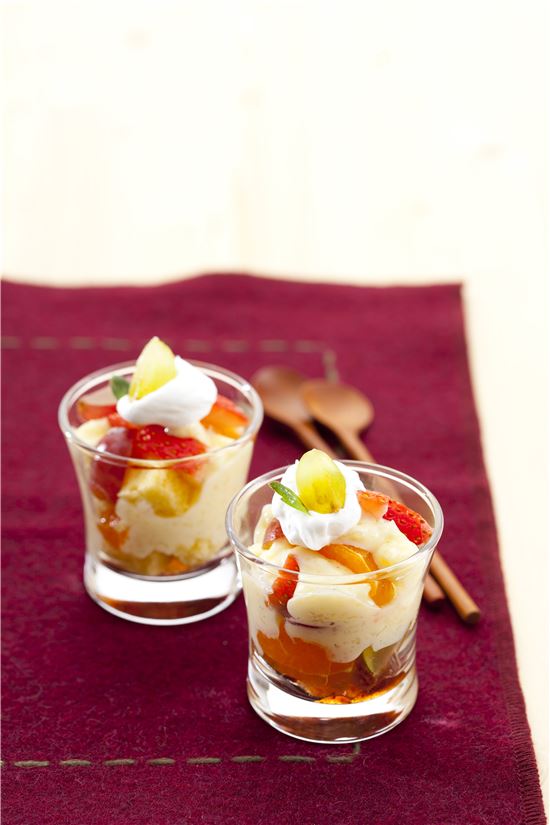 5. 투명한 유리잔에 딸기잼을 적당량 담는다. 카스테라와 과일은 적당한 크기로 자르고, 차가운 커스터드 크림을 담고 생크림으로 토핑한다.