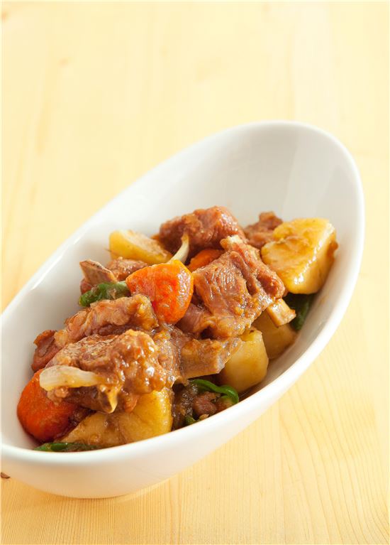 6.불을 세게 켜서 양념장 1/2과 감자, 당근을 넣어 끓이다가 다시 불을 중간 불로 줄여서 10분 정도 더 끓인 후 돼지갈비가 부드럽게 익으면 양파와 풋고추를 넣고 국물을 끼얹어가며 끓인다.