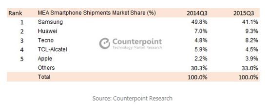삼성의 뒤를 이어 중국의 화웨이가 9.3%의 점유율로 2위를 기록했으며 현지업체인 테크노와 중국업체인 TCL-알카텔이 각각 8.2%와 4.5%를 차지했다.