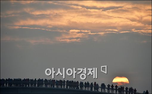 [아시아경제 윤동주 기자] 2016년 첫 일출을 보기 위해 서울 선유도 공원에 모인 시민들이 첫 해돋이를 지켜보고 있다.