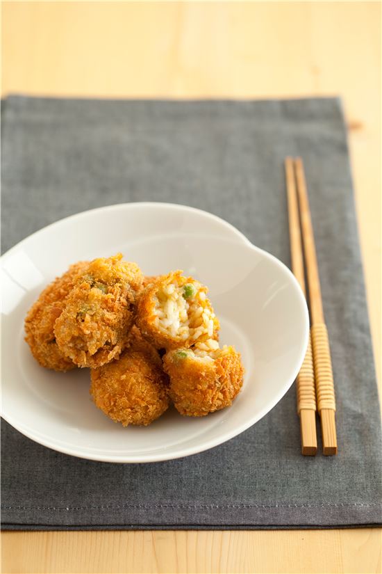 밥 1공기, 고베카레(레트로트포우치) 3, 완두콩 2, 다진양파 1, 소금약간, 밀가루 1/4컵, 달걀 1개, 빵가루 1컵, 식용유(튀김용)