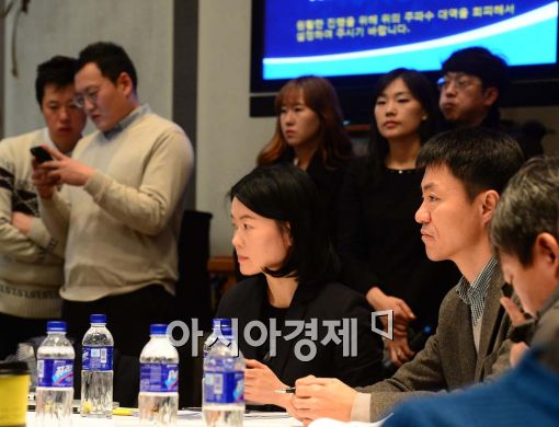 [아시아경제 백소아 기자] 유봉석 네이버 이사(오른쪽)와 임선영 카카오 이사(왼쪽)가 7일 서울 태평로 프레스센터에서 열린 네이버·카카오 뉴스 제휴 및 제재 심사 규정 발표 기자간담회에서 세부 규정을 경청하고 있다.