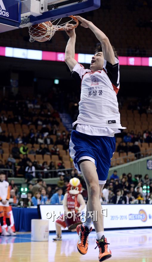 [잠실=아시아경제 김현민 기자] 2015~2016 프로농구 올스타전이 10일 서울 잠실실내체육관에서 열렸다. 본 경기에 앞서 덩크 콘테스트에서 LG 김종규가 호쾌한 덩크를 성공시키고 있다.