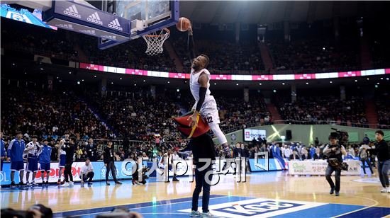 [잠실=아시아경제 김현민 기자] 2015~2016 프로농구 올스타전이 10일 서울 잠실실내체육관에서 열렸다. kt 블레이클리가 덩크 콘테스트 결선에서 호쾌한 덩크슛을 성공시키고 있다.