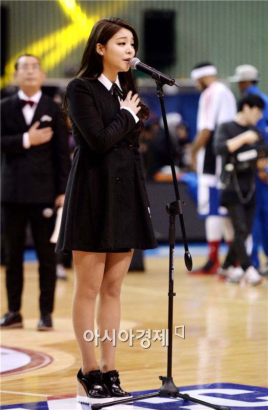 [잠실=아시아경제 김현민 기자] 2015~2016 프로농구 올스타전이 10일 서울 잠실실내체육관에서 열렸다. 가수 에일리가 애국가를 부르고 있다.