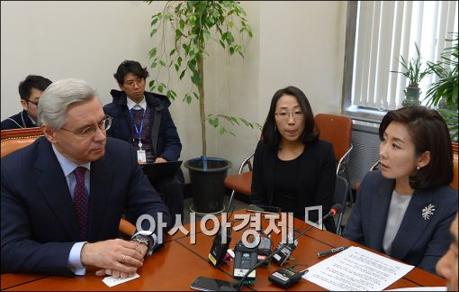 [아시아경제 윤동주 기자] 나경원 국회 외교통일위원장과 알렉산드르 티모니 주한 러시아 대사가 11일 서울 여의도 국회에서 북핵 관련해 간담회를 갖고 있다.
