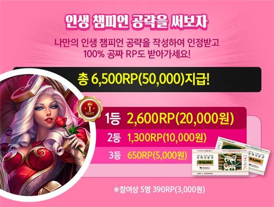 이번 이벤트는 '인생 챔피언 공략을 써보자'로 '리그오브레전드 헝그리앱' 커뮤니티에 이벤트 기간 동안 자신의 인생 챔피언을 선정해 해당 챔피언에 대한 공략을 작성하면 우수 공략을 선정해 총 6500RP를 순위에 따라 차등 지급한다. 본 이벤트는 1월17일까지 진행하며 자세한 내용은 '리그오브레전드 헝그리앱' 커뮤니티 이벤트 공지를 통해 확인할 수 있다.