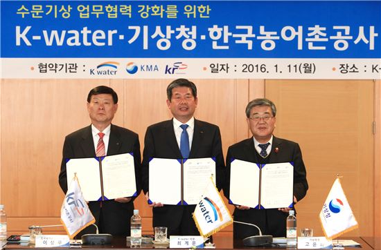 이상무 한국농어촌공사 사장(왼쪽부터)과 최계운 한국수자원공사 사장, 고윤화 기상청장은 11일 경기도 과천 한국수자원공사 수도권지역본부에서 수문기상 업무협력 강화를 위한 협약을 체결했다.