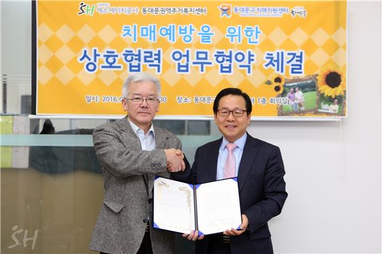 송지영 치매지원센터장(왼쪽)과 김보곤 동대문주거복지센터장이 14일 오전 동대문구내 임대주택에 거주하는 어르신에게 '치매통합관리서비스' 제공하는 업무협약을 체결했다.(자료:SH공사)