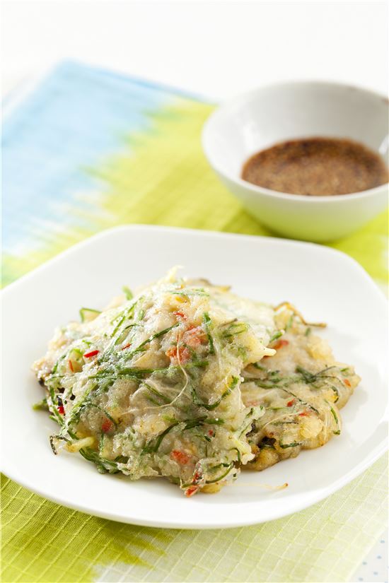 5. 식용유를 두른 프라이팬에 반죽을 한 숟갈씩 두르고 송송 썬 풋고추, 붉은 고추를 얹어 노릇하게 익힌 다음 초간장을 만들어 곁들인다.