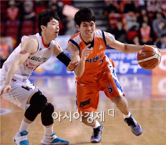 [인천=아시아경제 김현민 기자] 프로농구 인천 전자랜드와 부산 kt의 경기가 19일 인천 삼산월드체육관에서 열렸다. 전자랜드 정병국이 상대 김현수의 수비를 뚫고 공격하고 있다.
