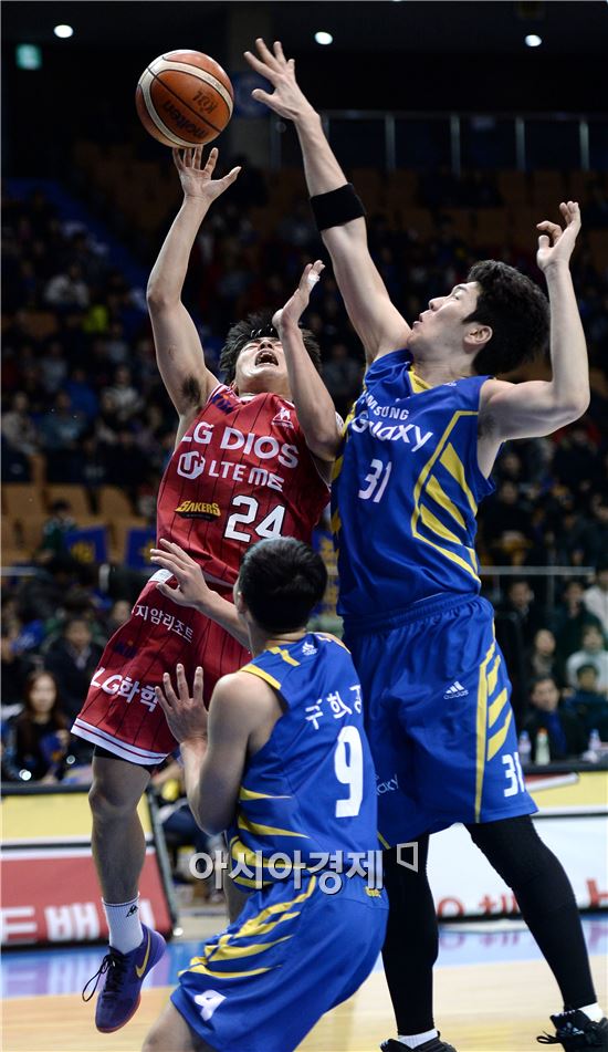 [잠실=아시아경제 김현민 기자] 프로농구 서울 삼성과 창원 LG의 경기가 20일 잠실실내체육관에서 열렸다. LG 정성우가 상대 김준일의 수비를 뚫고 슛하고 있다.