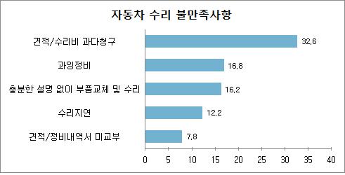 자동차수리 관련해 소비자가 가장 불만족하게 생각하는 것은 견적과 수리비를 과다하게 청구하는 것으로 32.6%의 소비자가 불만이라고 응답했다. 과잉정비에 대한 불만이 16.8%, 사전에 충분한 설명 없이 부품을 교체하거나 수리를 진행하면서 생기는 불만이 16.2%, 수리지연 12.2%, 견적·정비내역서 미교부 7.8%, 수리불량이 7.6% 였다.