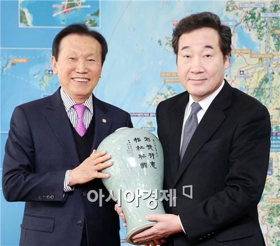 이낙연 전남지사(오른쪽)가 22일 오전 (사)한국지적발달장애인복지협회 전남협회 이용호 대표로부터 발달장애인의 복지 증진을 위해 노력한 공로로 감사패를 받고 있다. 감사패에는 ‘포덕행혜, 복지흥국’(평소 덕과 은혜를 널리 베푸는 복지행정을 펴 나라를 부흥 시킨다는 뜻)이라는 글귀가 새겨져 있다. 사진제공=전남도