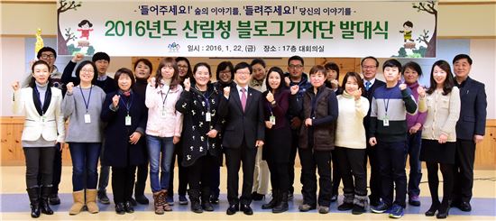 [아시아경제(대전) 정일웅 기자] 산림청은 22일 정부대전청사에서 ‘2016년 제7기 산림청 블로그 기자단 발대식’을 가졌다. 신원섭 산림청장(앞줄 왼쪽 여섯 번째)과 조준규 산림청 대변인(뒷줄 오른쪽 세 번째), 블로그 기자들이 파이팅을 외치며 기념사진을 찍고 있다. 산림청 제공