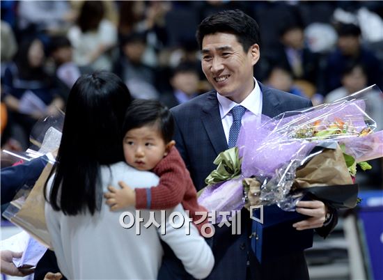 [고양=아시아경제 김현민 기자] 프로농구 고양 오리온과 인천 전자랜드의 경기가 22일 고양체육관에서 열렸다. 오리온 임재현 코치가 하프타임 때 은퇴식을 하고 있다.