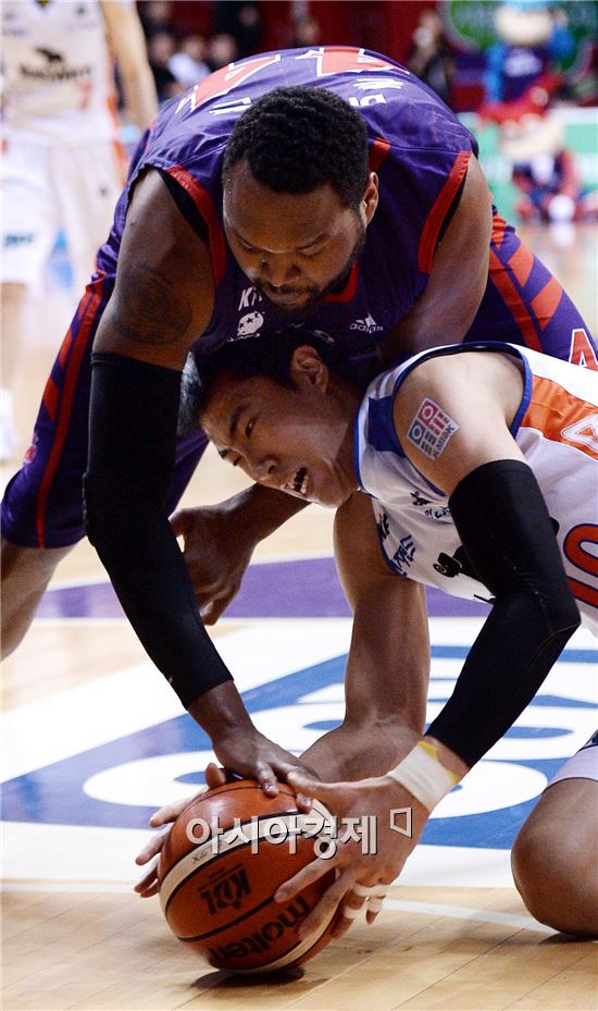 [고양=아시아경제 김현민 기자] 프로농구 고양 오리온과 인천 전자랜드의 경기가 22일 고양체육관에서 열렸다. 전자랜드 정효근이 상대 존슨과 공을 다투고 있다.