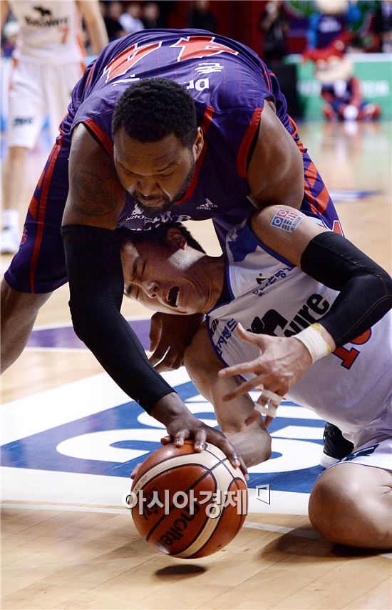 [고양=아시아경제 김현민 기자] 프로농구 고양 오리온과 인천 전자랜드의 경기가 22일 고양체육관에서 열렸다. 오리온 존슨이 상대 정효근과 공을 다투고 있다.