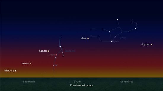 목성이 저녁에 제일 먼저 등장한다. 한 밤중에 화성이 얼굴을 내민다. 이어 덩치 큰 토성이 들어선다. '샛별' 금성이 이어받는다. 마지막으로 수성이 무대에 등장한다. 이 같은 현상은 오는 2월20일까지 계속된다.