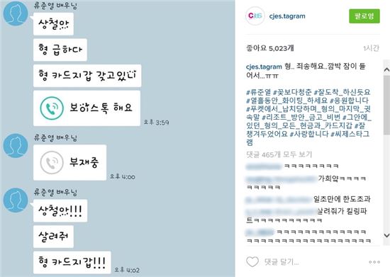 [아시아경제 온라인이슈팀] '꽃보다 청춘' 아프리카 편에 류준열 출연이 관심을 모으는 가운데, 류준열이 납치된 이후 매니저에게 남긴 카톡 메시지가 화제다.