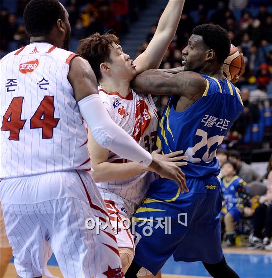 [잠실=아시아경제 김현민 기자] 프로농구 서울 삼성과 고양 오리온의 경기가 24일 잠실실내체육관에서 열렸다. 삼성 라틀리프가 상대 이승현의 수비에 고전하고 있다.