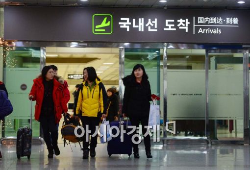 [아시아경제 백소아 기자] 25일 서울 강서구 김포공항 국내선청사에서 제주로 부터 온 승객들이 도착 게이트를 나서고 있다. 폭설과 한파가 겹치면서 지난 23일 오후 5시50분부터 폐쇄된 제주공항은 이날 오후 3시부터 운항을 재개한다.